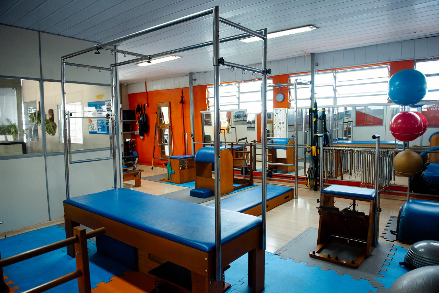 Sala de pilates com aparelhos, sala para aulas de ginástica coletiva, musculação e setor cardio